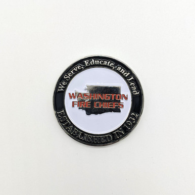 Washington Fire Chiefs Coin. Side 1:White background with Logo reading, "We Serve, Educate, and Lead" Side 2: Grey background reading, "Leadership: Proficiency, Action, Relationships."